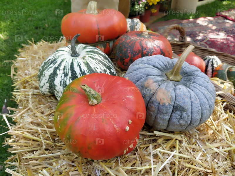 Серая тыква и несколько оранжевых на соломе. Ботанический сорт тыквы. Овощи кабачки и губки. Символ Хэллоуина. Осенний урожай. Allhalloween, All Hallows Eve или All Saints Eve