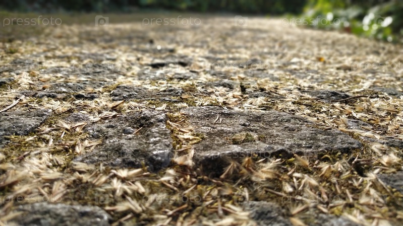 Видный булыжник с острыми краями. Старая брусчатка в городском парке. Тротуар в прогулочном парке. Камни обсыпаны семенами, шелухой, листьями, мхом, лишайником. Коричневые, бежевые осенние натуральные цвета