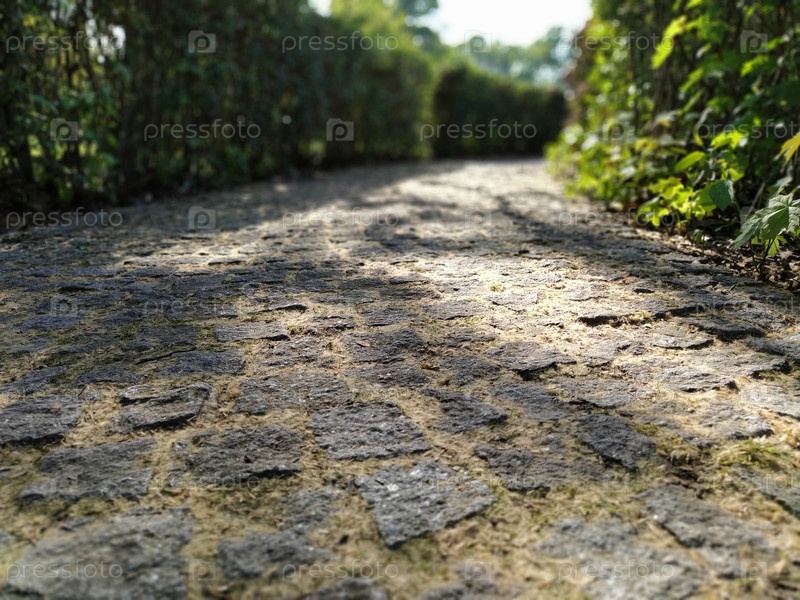 Мощеная земля, покрытая сухими листьями под солнечными лучами — классная картинка для фона. Старая брусчатка в парке, покрытом мхом и сухой травой. На заднем плане расфокусированная растительность