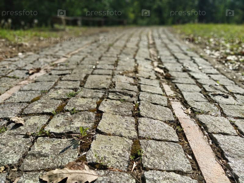 Булыжная земля, покрытая сухими листьями на солнце. Старые брусчатки в парке покрыты сухой травой и листьями. Расфокусированная растительность