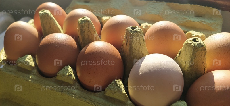 Куриные яйца в картонной упаковке. Бежевые яйца в контейнере при весеннем солнечном свете. Ингредиенты. Сельскохозяйственные продукты. Фермерская еда. Правильное белковое питание. Переработанная упаковка. Концепция демографии