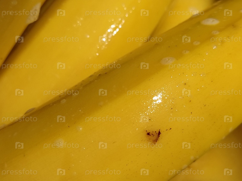 Мокрые бананы. Тщательно мойте овощи и фрукты водой с мылом. Профилактика инфекционных заболеваний. Желтые бананы крупным планом. Вегетарианство. Высокий гликемический индекс. Мыльная пена искрится на солнце