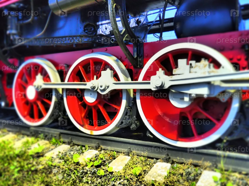 Ретро винтажные колеса локомотива или поезда закрываются. Красные большие тяжелые металлические колеса с поршневыми направляющими механизмами. Паровоз 19-20 веков с паровой машиной. Яркое живое фото