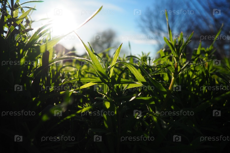 Молодая сочная зеленая трава в лучах утреннего солнца на фоне голубого неба. Весна в Сербии. Солнечный март. Деревья еще не выпустили свои листья. Трава крупным планом, малая глубина резкости