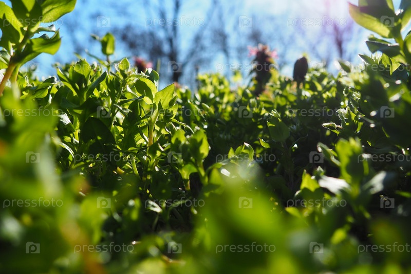 Молодая сочная зеленая трава в лучах утреннего солнца на фоне голубого неба. Весна в Сербии. Солнечный март. Деревья еще не выпустили свои листья. Трава крупным планом, малая глубина резкости