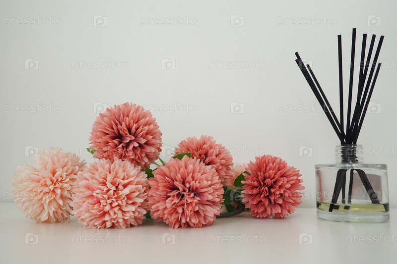 Композиция с ароматическими палочками, эфирным маслом в стеклянной вазе и розовыми махровыми искусственными цветами в интерьере белой комнаты. Белый фон. Много цветов и ароматических палочек