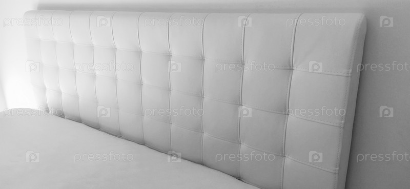 Мягкое изголовье. Обивка для мебели из натуральной или искусственной кожи и стеганой ткани. Мягкое изголовье у светлой стены. Черно-белое монохромное фото