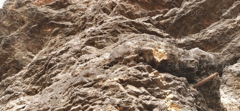 Каменная скала крупным планом. Сараево, Босния и Герцеговина. Древняя застывшая лава. Слои и толщи горных пород. Гора после управляемого взрыва проложила дорогу. Текстура камня. Серый и бежевый цвета