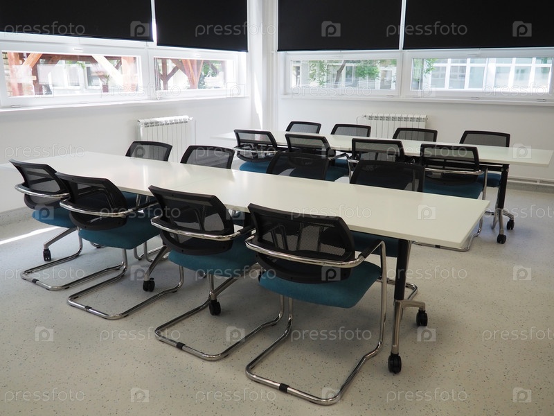 Стол и стулья в переговорной в офисе, в классе или в зале библиотеки. Белая, черная и серая краска в интерьере. Черные жалюзи для затемнения комнаты. Современный дизайн интерьера
