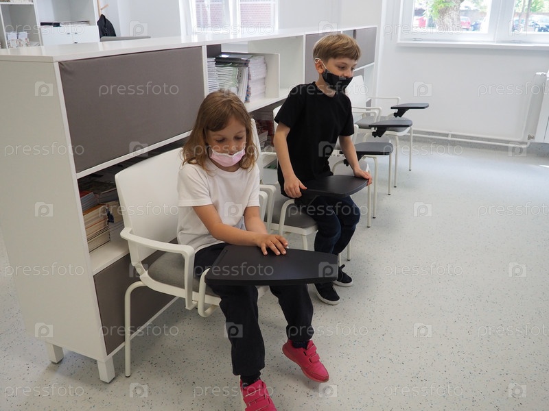 Мальчик и девочка в школьной библиотеке. Дети сидят возле книжного шкафа. Современное школьное оборудование. Поворотные столы