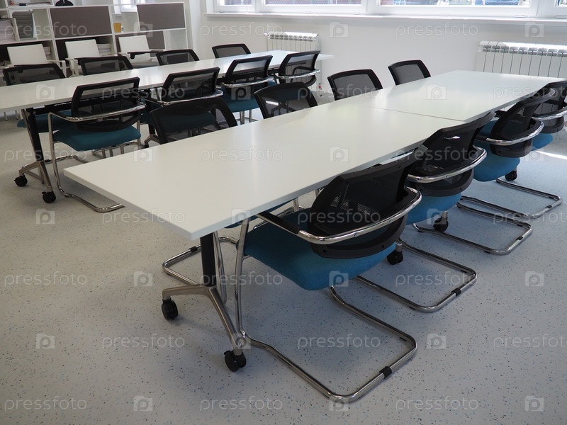 Стол и стулья в переговорной или в аудитории. Библиотека, офис или помещение в официальном учреждении или банке. За столом никого нет. Белая, черная и серая краска в интерьере