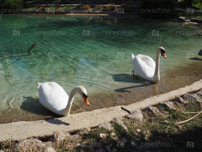Два белых лебедя на берегу водохранилища. Птицы у воды чистят перья. Станишичи, Биелина, Босния и Герцеговина, зоопарк в этнодеревне. Фауна Европы