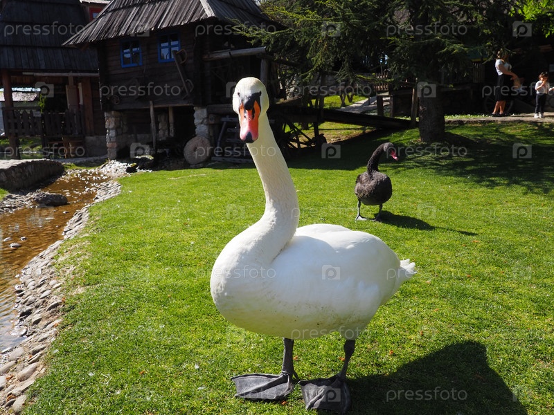 Станишичи, Биелина, Босния и Герцеговина, 25 апреля 2021 г. Белый лебедь на зеленой траве летним днем. Фауна Европы