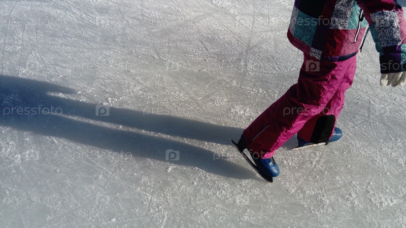 Дети катаются в городском парке на катке. Ноги и руки фигуриста во время катания на льду. Девушка одета в розовую спортивную одежду. Синие фигурные коньки, одетые на ножки