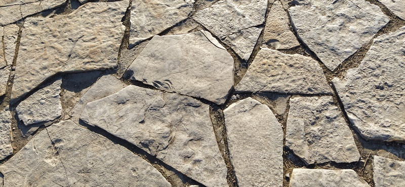 Брусчатка из больших плоских камней в центре старого города. Булыжники, разделенные слоями, укладываются по порядку, как дорожная плитка. Натуральные серые и коричневые тона камня на закате