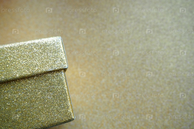 Золотая подарочная коробка на золотом фоне. Декоративная коробка-сюрприз. Скопируйте пространство