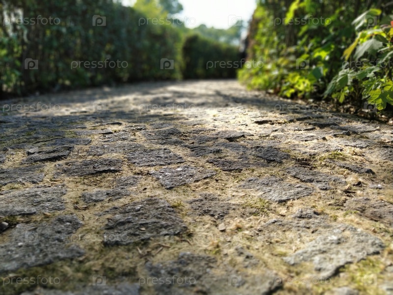 Мощеная земля, покрытая сухими листьями под солнечными лучами — классная картинка для фона. Старая брусчатка в парке, покрытом мхом и сухой травой. На заднем плане расфокусированная растительность