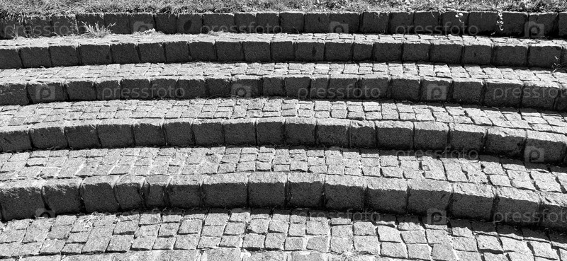Полукруглые ступени амфитеатра. Широкая лестница из каменных блоков или кирпича. Неровные кирпичи. Старые ступени круглые. Монохромная черно-белая фотография