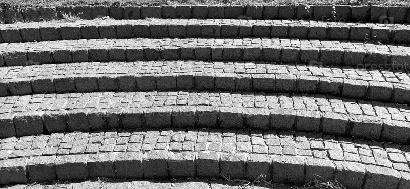 Полукруглые ступени амфитеатра. Широкая лестница из каменных блоков или кирпича. Неровные кирпичи. Старые ступени круглые. Монохромная черно-белая фотография