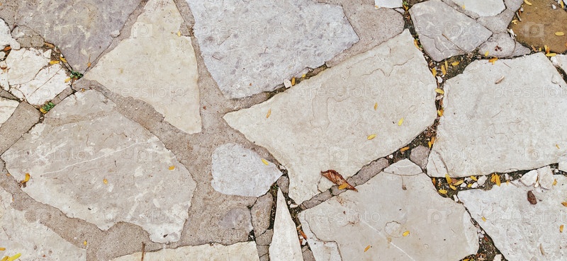 Тротуар вымощен неровными натуральными серыми и коричневыми камнями. Между щебнем булыжника есть мелкая галька, земля, песок, трава. Солнечное освещение. Площадь в старом европейском городе