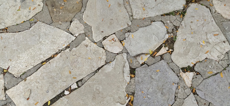 Тротуар вымощен неровными натуральными серыми и коричневыми камнями. Между щебнем булыжника есть мелкая галька, земля, песок, трава. Солнечное освещение. Площадь в старом европейском городе
