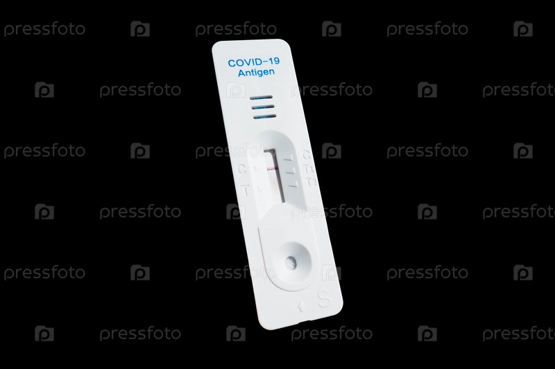 Результат теста на COVID-19 отрицательный, заражения нет, с использованием оборудования для экспресс-тестирования. Тест на коронавирус, черный фон. Скопируйте пространство. Тестирование концепции коронавирусной инфекции