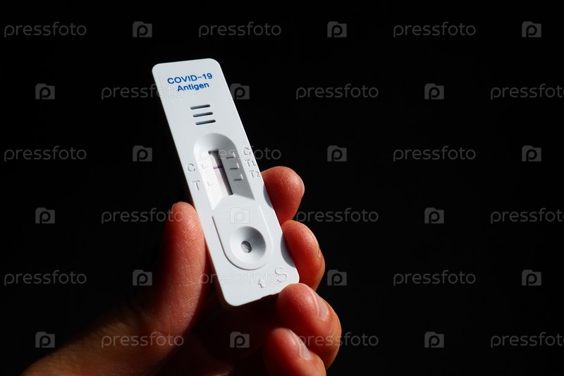 Результат теста на COVID-19 отрицательный, заражения нет, с использованием оборудования для экспресс-тестирования. Тест на коронавирус в руке, черный фон. Копируйте пространство. Концепция тестирования на коронавирусную инфекцию