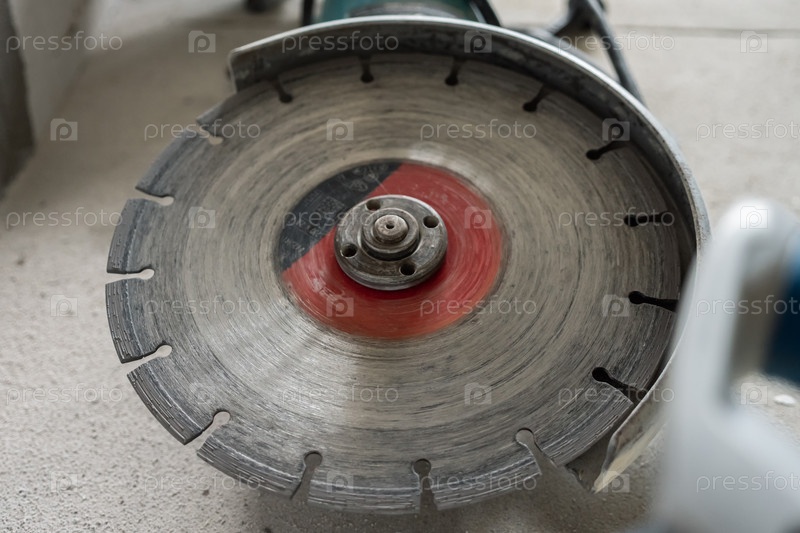 Крупный план поцарапанного диска на бетоне на угловой шлифовальной машине. Выборочный фокус. Концепция ремонта помещения