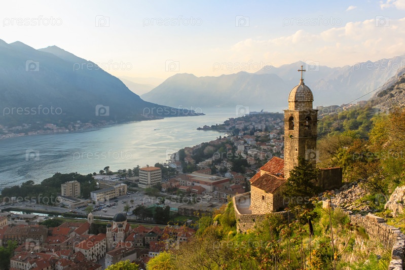 Христианский храм на фоне моря и гор. Бако-Которская бухта на закате. Концепция туризма в Черногории