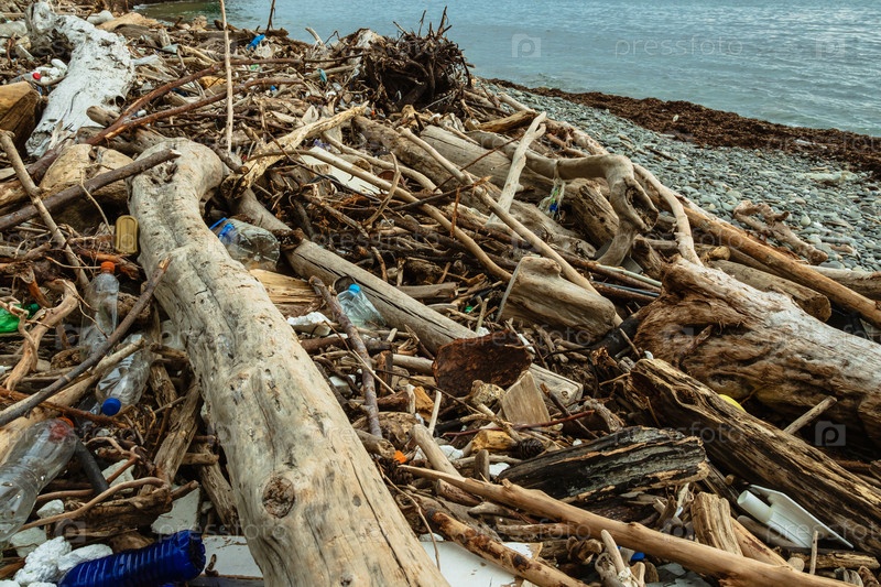 Пластиковые бутылки, бревна и другой мусор на скалистом берегу. Мусор на пляже после шторма. Понятие экологии