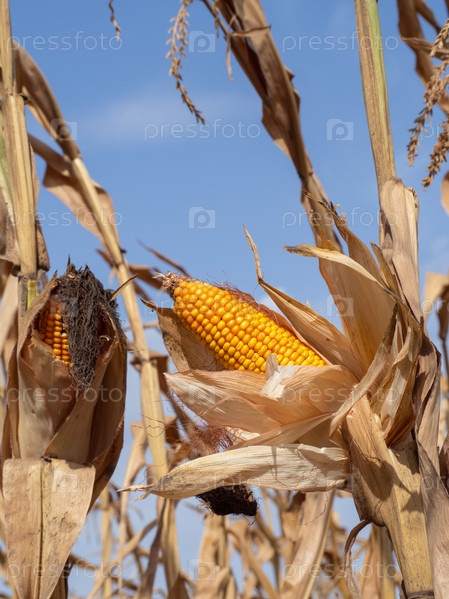 Колосья спелой золотой кукурузы (кукурузы) на кустах на фоне неба. Спелая кукуруза в початках
