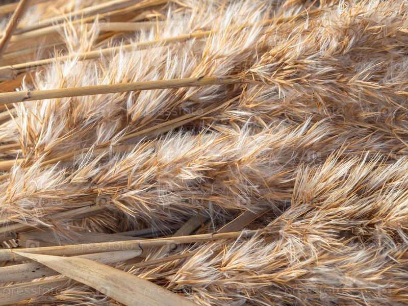 Светлый фон с обыкновенным камышом. Скопируйте пространство. Фон сухой желтой травы. коричневые пучки тростника крупным планом