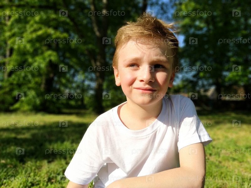 Милый мальчик улыбается и смотрит в сторону. Ребенок одет в белую футболку и синие брюки. Светлые волосы красиво падают на лоб. Длинные светлые ресницы. Парк на заднем плане
