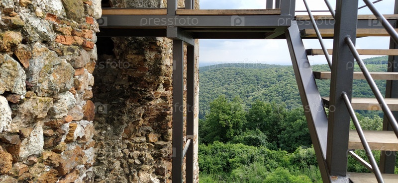 Руины старой крепости в Врднике, Сремска-Митровица, Воеводина, Сербия. Древние каменные стены, горные дали. Металлическая лестница в небо. Туристические исторические достопримечательности