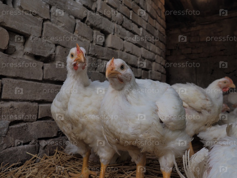 Ферма белых кур, настоящие пейзажи. Куры в деревенском сарае. Разведение птицы для производства яиц и мяса. Птицеводство и животноводство. Многие птицы сидят и ходят