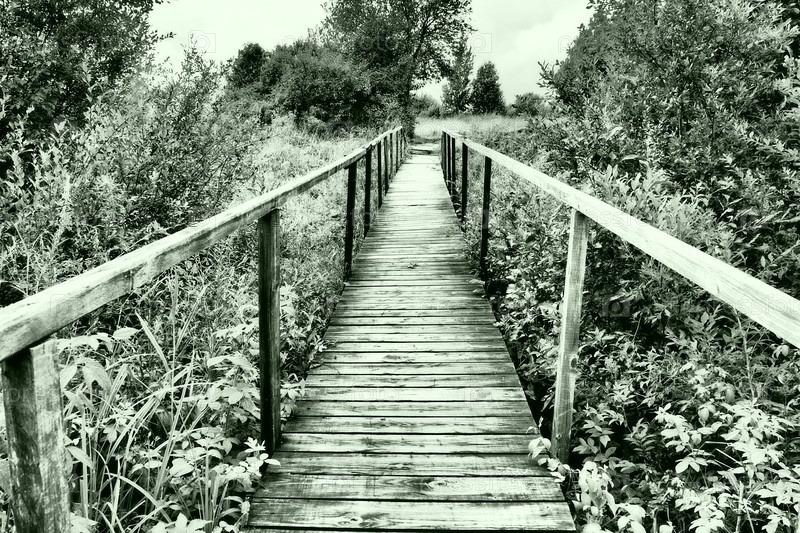 Старый деревянный подвесной мост через болотистую канаву с высокой зеленой травой. Дорога в никуда. Заброшенное место. Походы на природу. Два длинных поручня для безопасности. Станция Нырки, Карелия. Пасмурный вечер