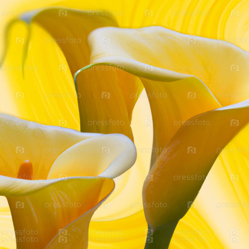 Прекрасные нежные желтые каллы с зелеными листьями. Поздравительная открытка или этикетка для продукта с ароматом лилии каллы. Желтый фон. Зантедескиа, калла. Пестик-початок