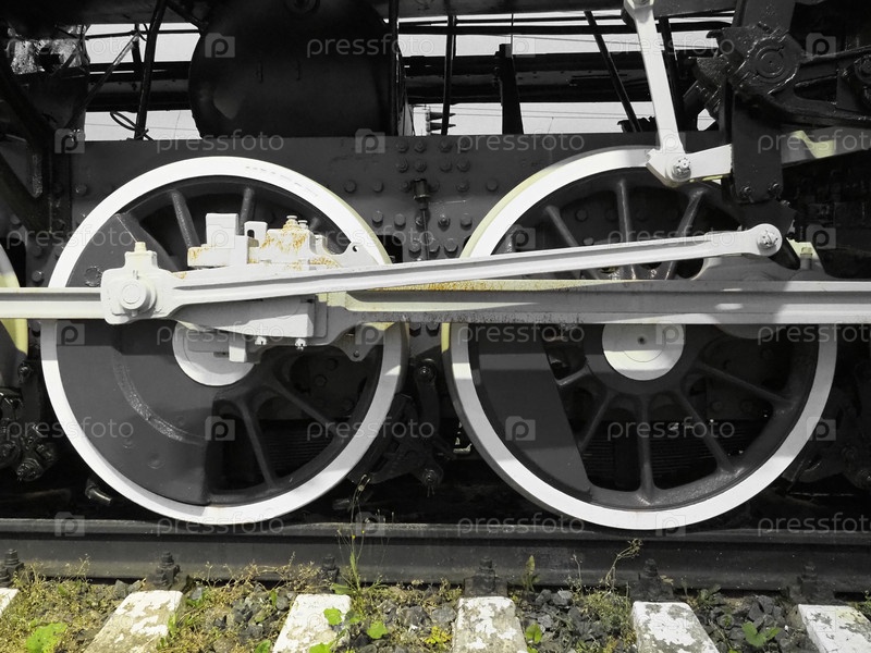 Ретро-поезд на двух колесах. Шпалы и рельсы, механизмы, поршни и направляющие. Паровоз 19 начала 20 века с паровой машиной. Черно-белые колеса с зеленой травой. Винтажный стиль