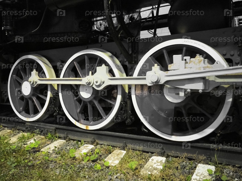 Ретро-поезд на двух колесах. Шпалы и рельсы, механизмы, поршни и направляющие. Паровоз 19 начала 20 века с паровой машиной. Черно-белые колеса с зеленой травой. Винтажный стиль