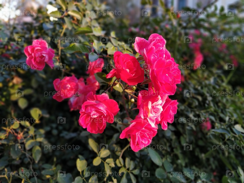 Брызги розовых роз. Красивые нежные цветы роз на фоне зеленых листьев, бутонов и шипов. Мягкое освещение. Мягкий фокус. Открытка. Стрельба в золотой час