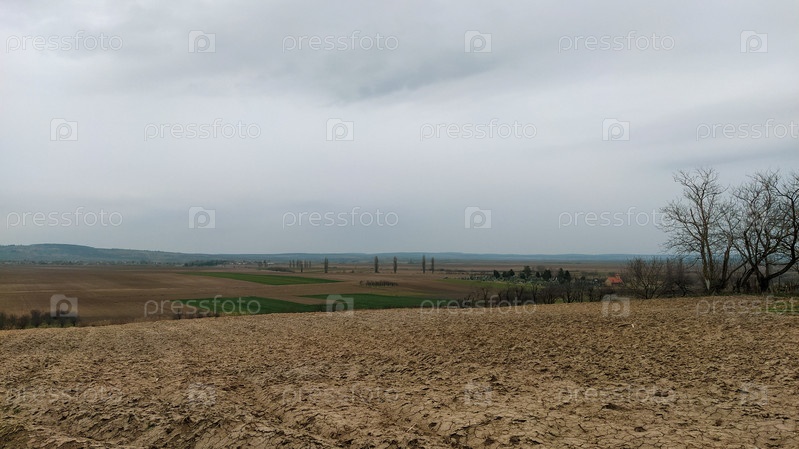 Свежевспаханное поле. Пахотная земля с плодородной почвой для посадки пшеницы. Сельский пейзаж в Сербии, на Балканах, а именно Фрушка-Гора от Сремска-Митровицы. Борозды и ямы. Подготовительные сельскохозяйственные работы