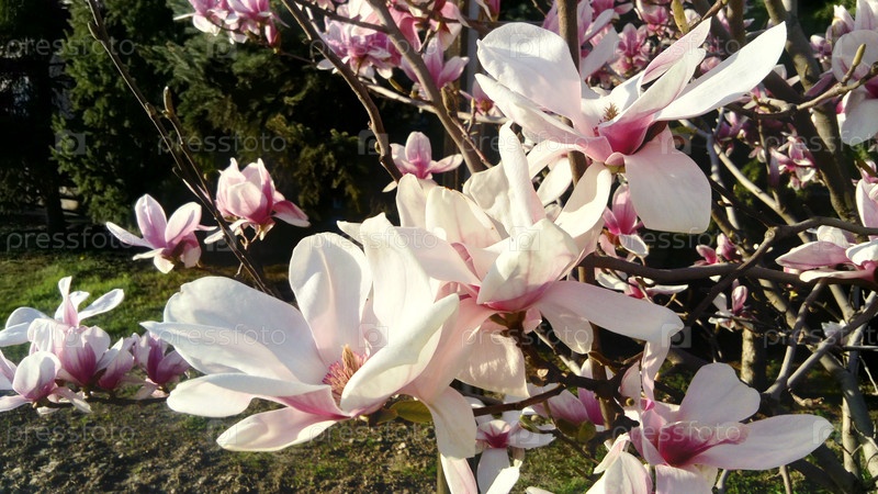 Красивые цветущие белые цветы и бутоны магнолии на ветвях без листьев. Розовые пестики и тычинки. Приглашение на свадьбу или открытка. 8 марта. Начало весны. Нежные белые лепестки