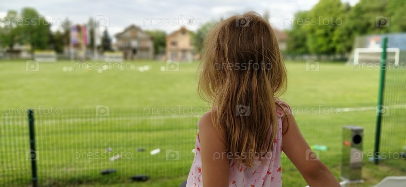 Девушка сидит спиной к камере и смотрит футбольный матч детских команд. Красивые длинные светлые волосы. Футбольные болельщики в матче