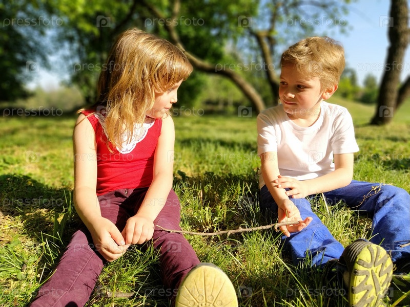 Милый мальчик и девочка со светлыми волосами сидят на траве и смотрят друг на друга. Дети в поле