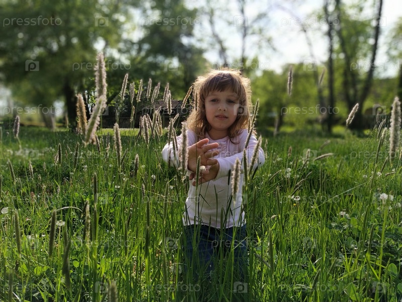Девушка на лугу. Похожая на осоку зеленая трава окружает ребенка. Концепция экологии и гармонии с природой. Милая девушка трогает растения руками. Спокойная жизнь в глубинке