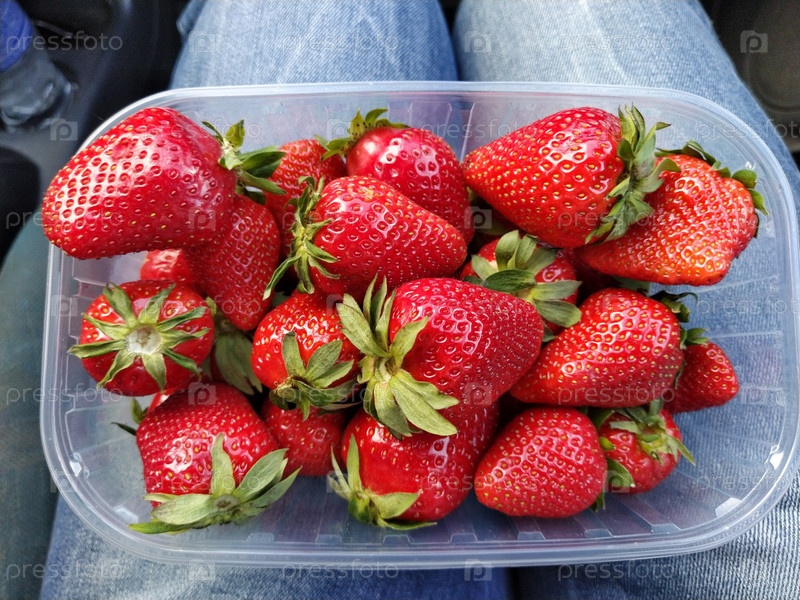 Свежая клубника в прозрачном пластиковом контейнере. Красивые красные ягоды садовой клубники
