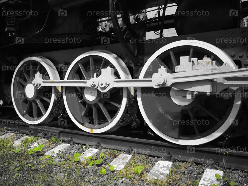 Ретро-поезд на двух колесах. Шпалы и рельсы, механизмы, поршни и направляющие. Паровоз 19 начала 20 века с паровой машиной. Черно-белые колеса с зеленой травой. Винтажный стиль