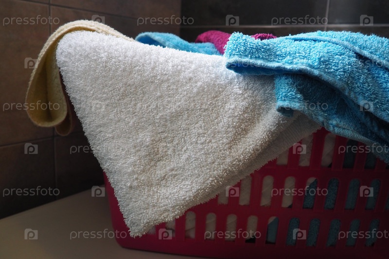 Полотенца в корзине для белья. Синие и розовые хлопковые махровые полотенца брошены в розовую пластиковую корзину. Уборка. Хранение и разделение белья перед стиркой. Свет сверху из открытого окна