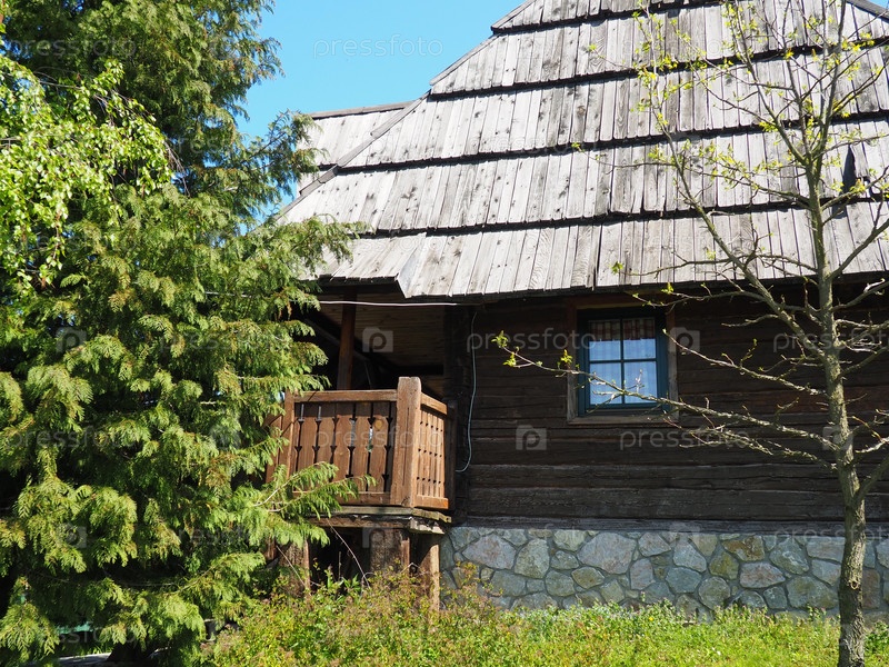 Деревянный деревенский дом. Традиционное боснийское горное жилище XIX века. Восстановлены этнопостройки, орудия сельскохозяйственного труда