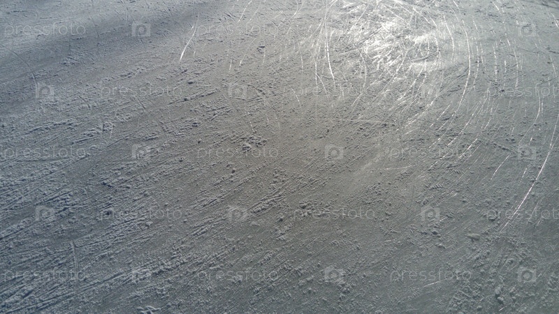 Лед с прожилками от кончиков коньков. Фигурное катание на льду. Поверхность ледовой арены после тренировки фигуристов. Солнечный луч на мокром весеннем льду. Снег и замерзшая вода